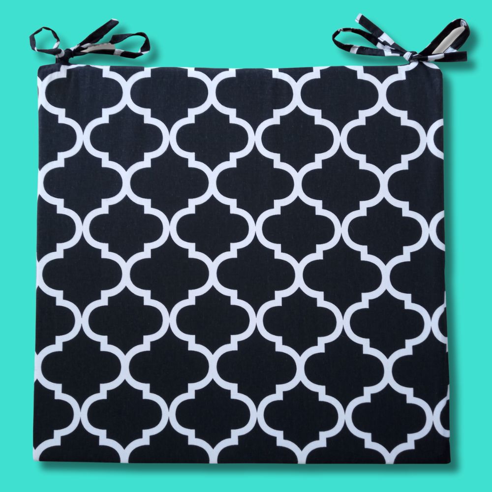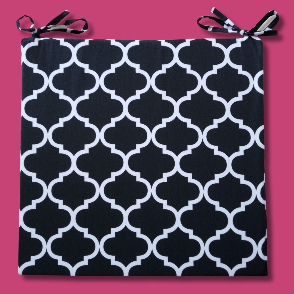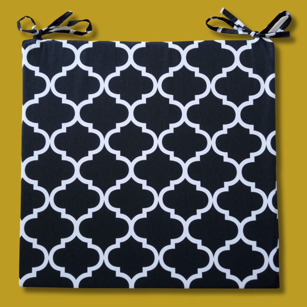 Poduszka na krzesło z marokańskim ornamentem na czarnym tle to wyrazisty i egzotyczny element dekoracyjny, który dodaje pomieszczeniu dramatyzmu i charakteru.