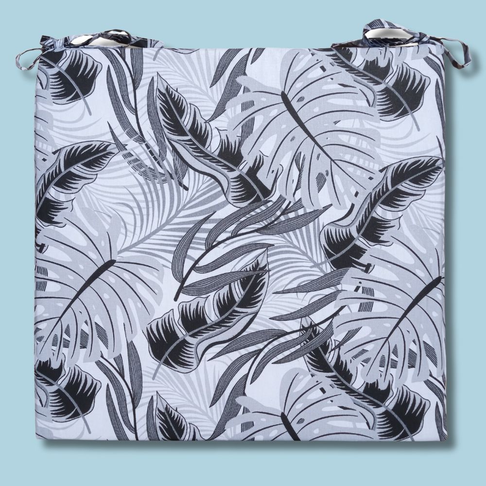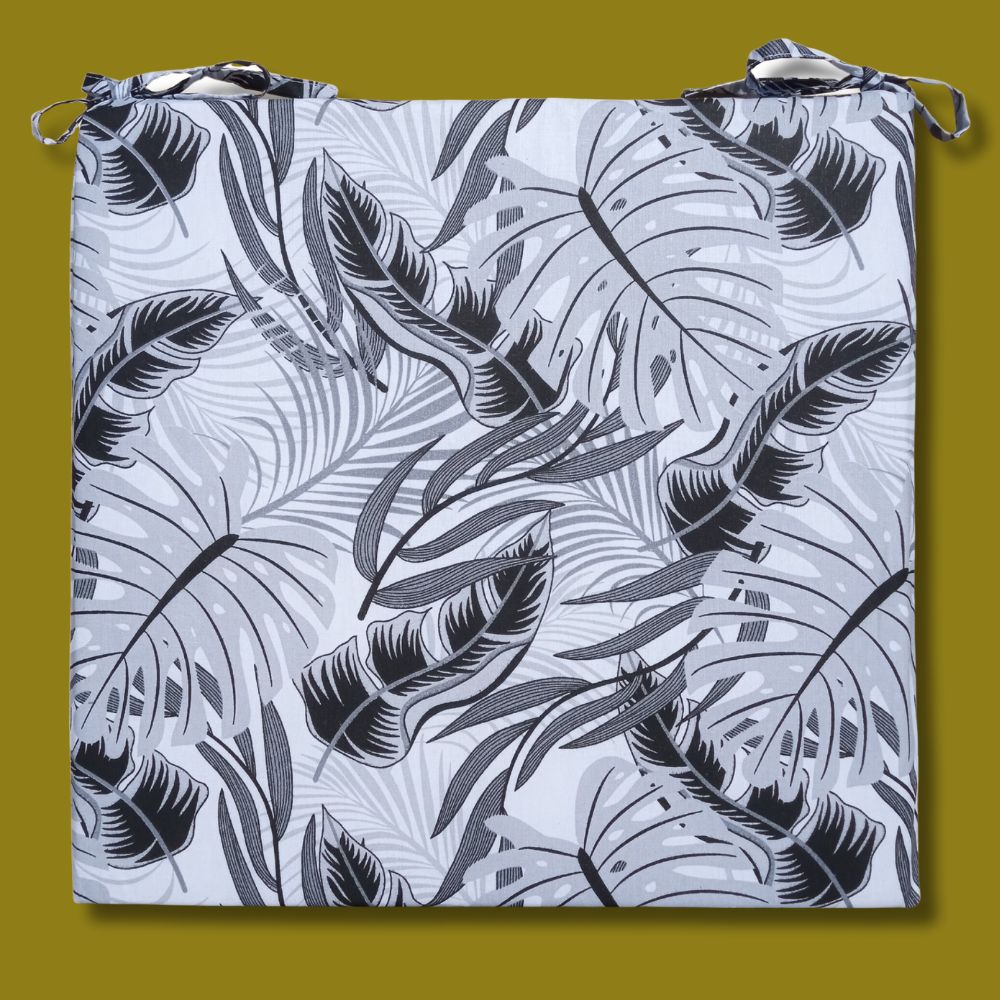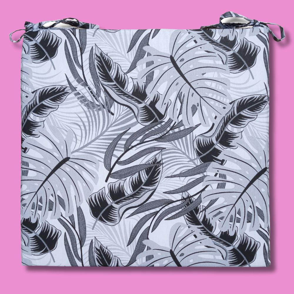 Poduszka na krzesło ze wzorem szarych i czarnych liści monstery.